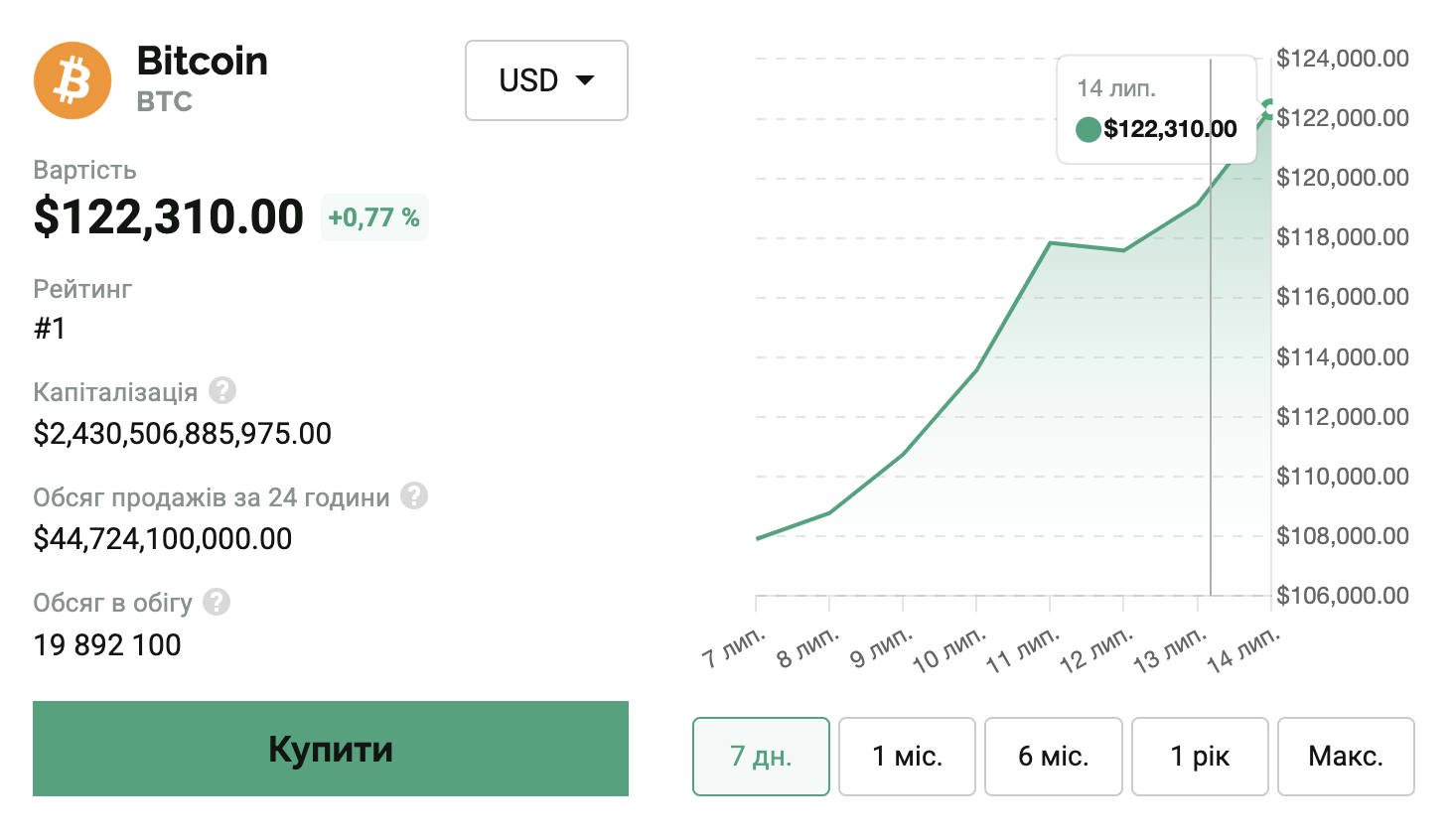 В ночь на 14 июля 2025 года цена биткойнов снова несколько дней установила новый рекордный максимум (ATH). Первая криптовалюта увеличилась выше отметки 122 600 долларов. На момент написания актива был зафиксирован на уровне 122 долл. США 310.
