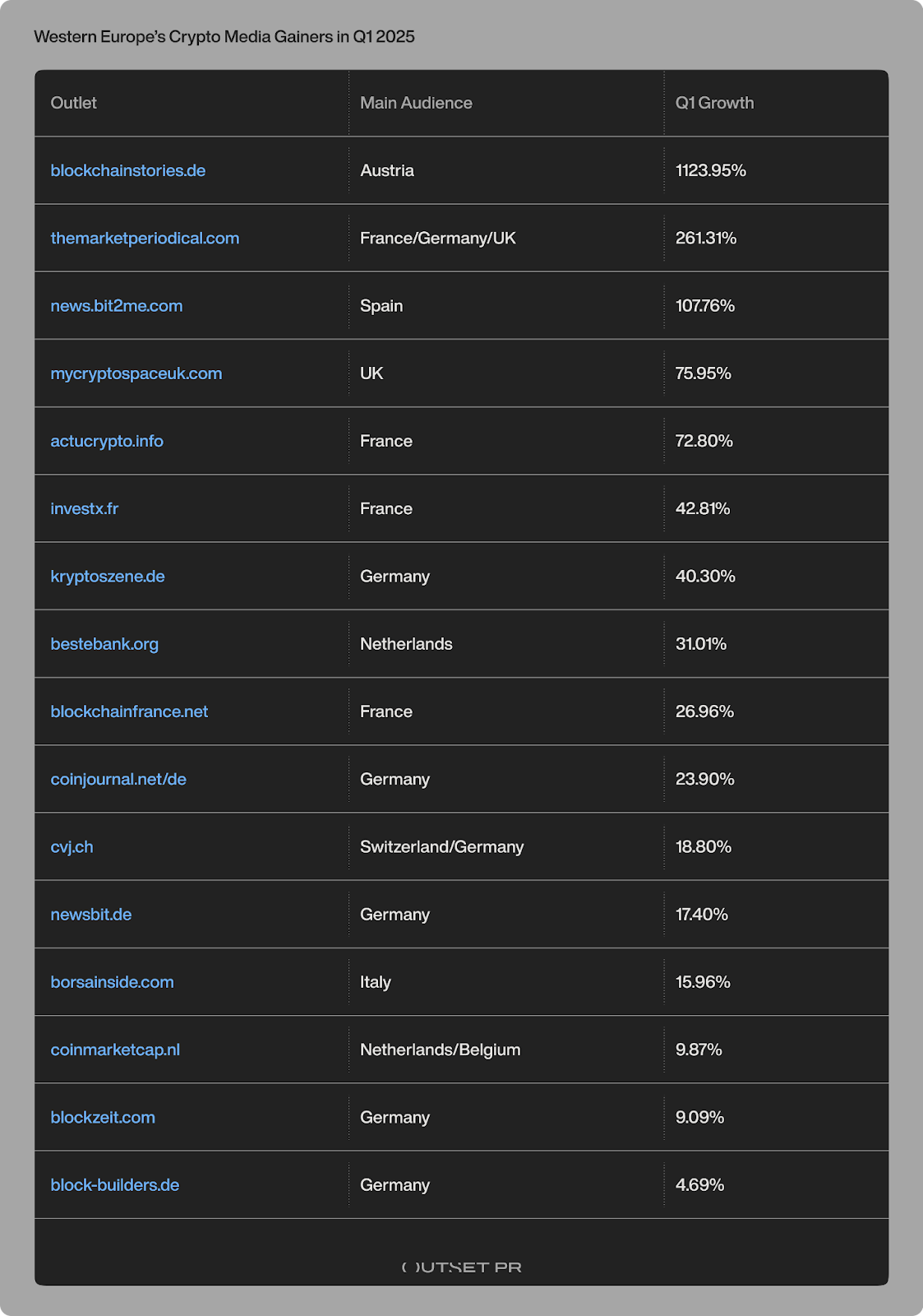 Еще более интересная статистика: только 16 веб -сайтов зафиксировали увеличение на протяжении всего квартала 2025 года, и только половина из них выросла месяц за месяцем. Пример? Blockchainstories.de вырос на 768% в феврале, но он продолжает составлять ниже 10 000. посещения в месяц.