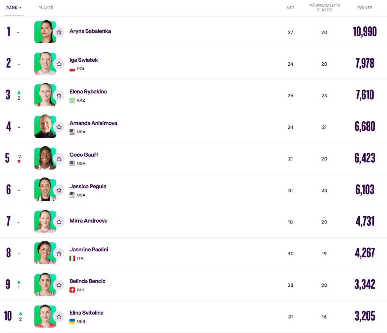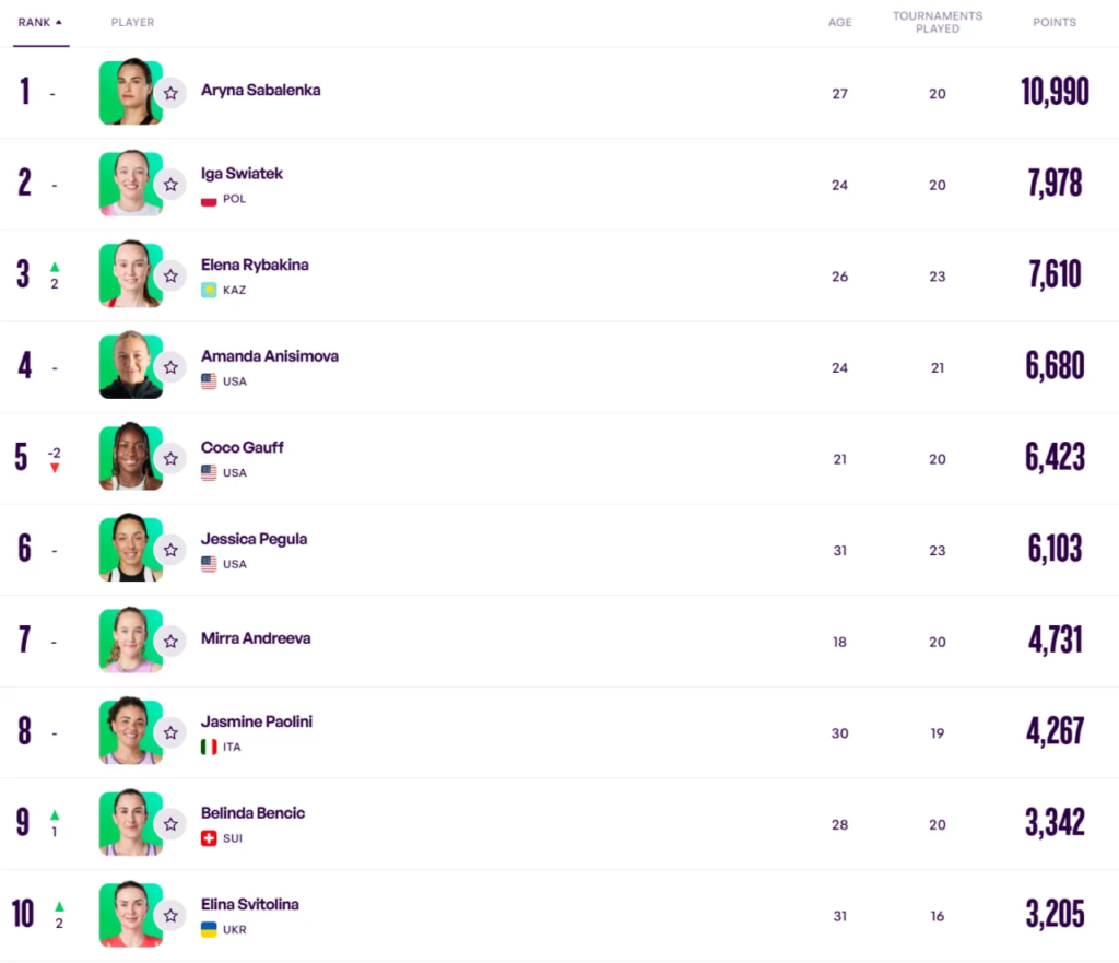 WTA: Свентек по-прежнему второй, Собаленко лидирует, Рыбакина выходит вперед