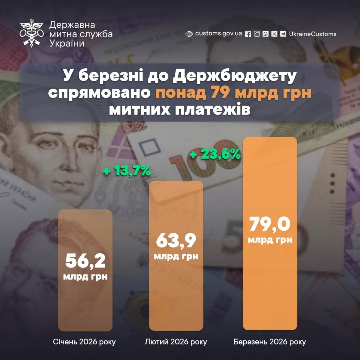 Согласно обнародованной инфографике, таможенные поступления демонстрируют стабильный рост ежемесячно: от 56,2 млрд. грн. в январе до 79,0 млрд. грн. в марте.