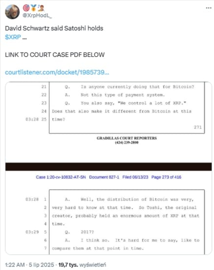 Именно в этой части свидетельств Шварц неожиданно заявил: «Сатоши, оригинальный создатель биткойнов, вероятно, имел огромное количество XRP в то время»Полем Когда его спросили, в каком году он имел в виду, он ответил «2017»Полем Этот комментарий, хотя он не имел решающего значения для этого вопроса, вызвал большой интерес из -за его последствий и длинной секретной личности Накамото.