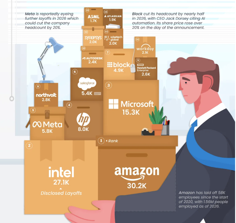 Многие крупнейшие увольнения в технологической сфере в 2025 и 2026 годах отражают схожий набор давлений: замедление роста, более жесткий контроль затрат и увеличение инвестиций в искусственный интеллект.