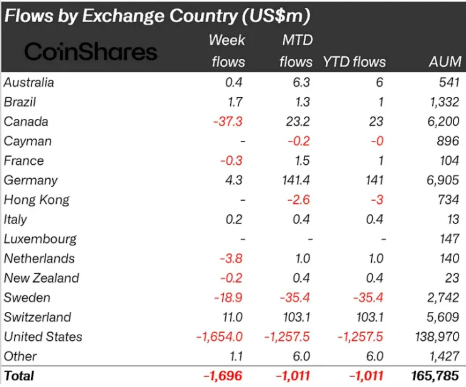 Больше всего криптовалюту «сбрасывают» в США — оттуда ушло $1,65 млрд. Также отток был зафиксирован в Канаде и Швеции, тогда как Германия и Швейцария продемонстрировали символический рост.