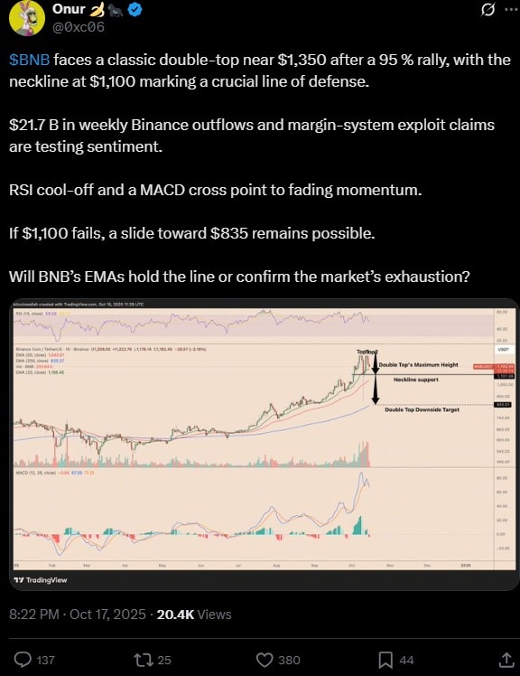 В свою очередь, аналитик рынка по прозвищу Онур считает, что токен проходит серьезное испытание на стабильность после недавнего оттока капитала. По оценкам эксперта, истечение срока действия RSI и пересечение MACD указывают на ослабление динамики альткоина. Онур прогнозирует, что если Binance Coin не достигнет $1100, возможно снижение до $835.