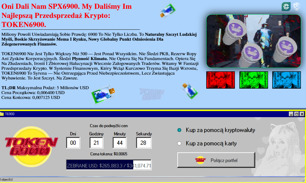 Token6900 работает в стандарте ERC-20 И он представляет собой чистую память, чья ценность построена только сообществом. Нет случаев использования, никаких технологических инноваций или обещаний развития — только юмор, мемы и участие инвесторов. Тем не менее, это не помешало проекту собрать более 242 000 долл. США от ранних покупателей, что хорошо свидетельствует о его потенциале.