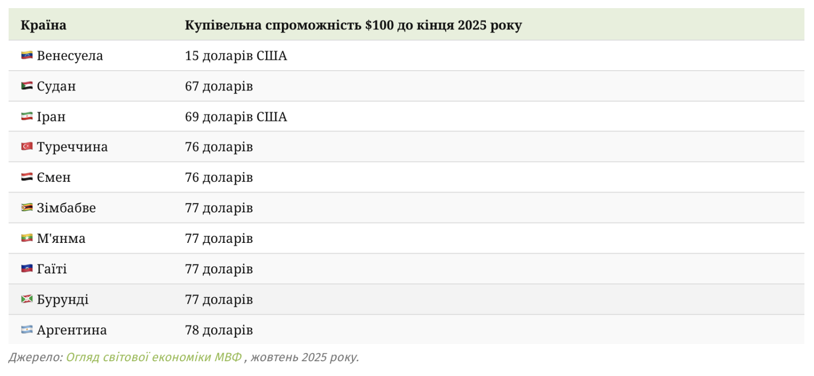Используя прогнозные темпы инфляции на 2025 год от Международного валютного фонда (МВФ), Visualcapitalist подсчитал, сколько будет стоить к концу 2025 года эквивалент 100 долларов в начале года.
