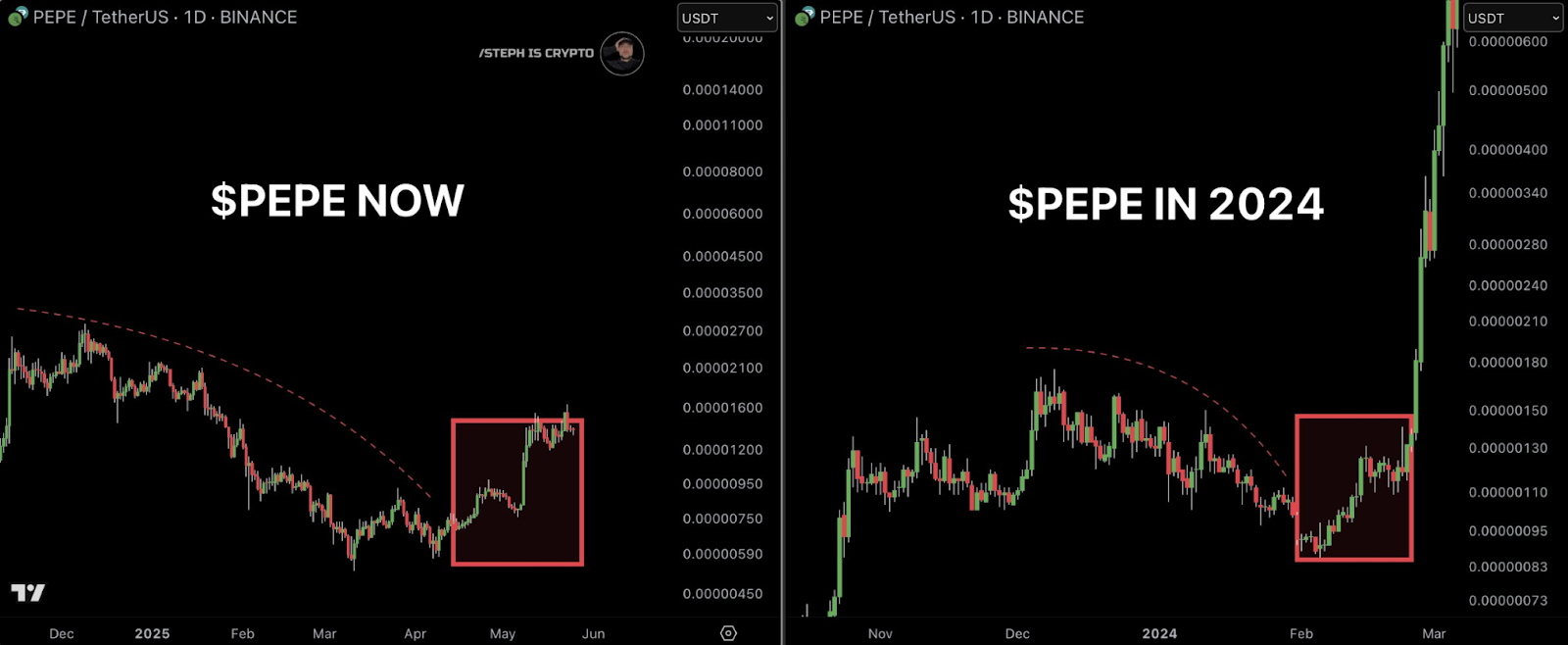 Интересно, что криптовалюта Пепе на тему лягушки показывает, что она может подготовиться к быстрому повышению цен. Аналитик по криптовалюте «Steph Is Crypto» представил сравнение двух ежедневных диаграмм Peepe/USDT, одной из 2025 года и другой из начала 2024 года. Обе диаграммы показывают аналогичную шаблон, выделенную красным. Тенденция наследования, период консолидации и сильный митинг.