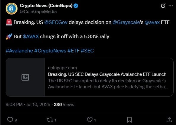 Несмотря на то, что в конце недели ускорилась лавина на прошлой неделе, в конце недели появилась большая угроза, которая может сломать хороший пробег. Все из -за решения SEC относительно заявления на Avax ETFПолем Американская комиссия по ценным бумагам и обмену изменила дату рассмотрения заявки на ETF от Greyscale.