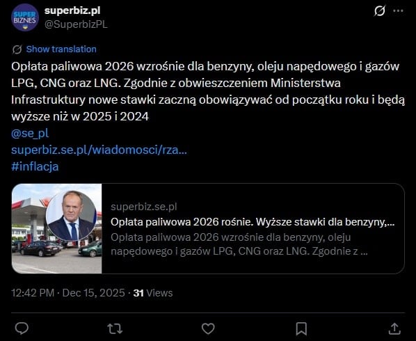 Во время последней кампании перед парламентскими выборами Дональд Туск на одной из встреч с избирателями заявил, что если бы он был премьер-министром, топливо стоило бы 5,19 злотых за литр. Политик уже два года является премьер-министром Польши. Однако топливо так и не приблизилось к обещанной цене и продолжает дорожать.