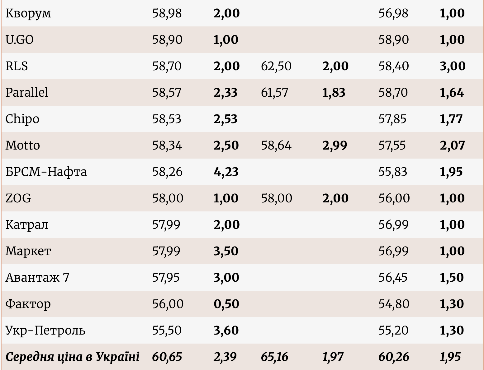 - Бензин А-95: в группе подорожал на 7,86 грн/л (до 56,83 грн/л), при этом цена на АЗС выросла в среднем на 2,39 грн/л (до 60,65 грн/л).