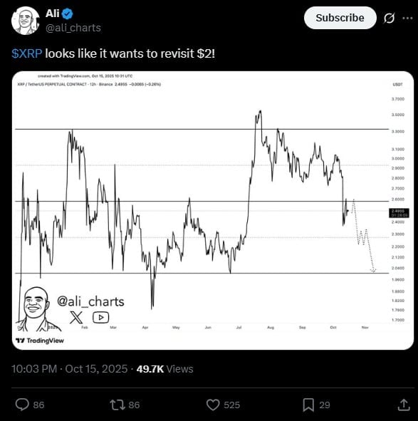 Хотя несколько дней назад токен изо всех сил пытался удержаться на уровне трех долларов, вскоре он может упасть ниже двух. В одной из последних записей на X Али Мартинес указал, что этот сценарий становится все более реальным, и держателям XRP следует иметь это в виду. По оценке эксперта «Похоже, он хочет вернуться к 2 долларам». По сравнению с пиком этого года это снижение стоимости примерно на 35%.