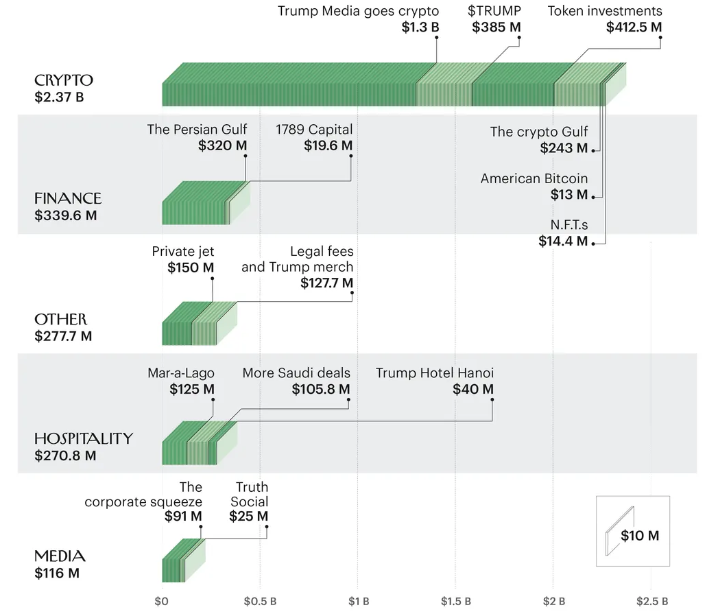 Хотя точная стоимость активов президента неизвестна, потому что он отказался добровольно представлять налоговые декларации, средства массовой информации приводят различные цифры. Например, в мае 2025 года The New York Times написала, что месяц семья Трампа заработала до 2 миллиардов долларов в различных проектах, в том числе не только криптокон, но и недвижимость, подарки и гонорары.