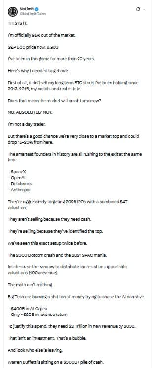 Скрытие на платформе X под ником NoLimit. инвестор с более чем 20-летним опытом работы на рынке (и множеством точных прогнозов) недавно объявил, что вывел с фондового рынка 95%. Он сохранил только свои долгосрочные позиции в биткойнах, драгоценных металлах и недвижимости. Правда, это не означает немедленного краха. Но, по его мнению, рынок может быть очень близок к вершине.