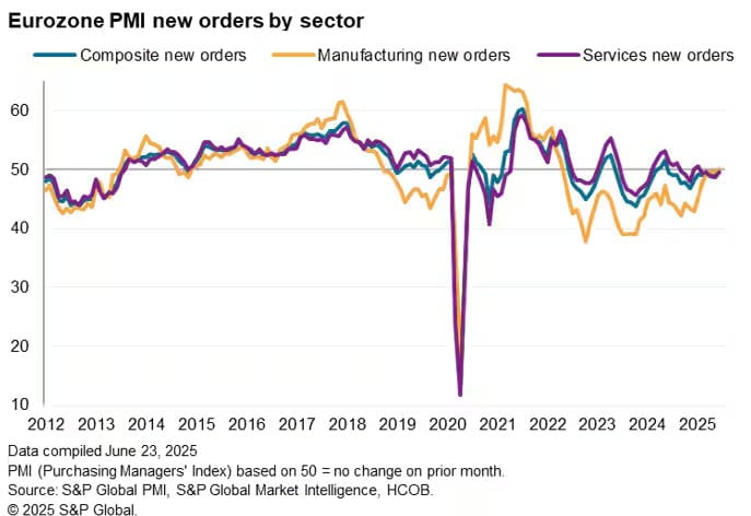 Июнь Предварительный композит PMI для евроразработанный S & P Global, остановился на уровне 50,2 балла — точно то же самое каждый месяц раньше. Ни вверх, ни вниз. Это продолжение тенденции, которая продолжается с начала года: экономика Еврозоны работает с минимальной возможной скоростью без технической рецессии.