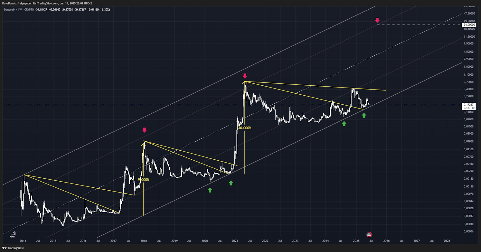 Кроме того, аналитик заметил, что Dogecoin может продолжать повторять свою схему для превосходства предыдущего цикла. Если это повторилось, он предсказал, что токен может запустить более 24 долларов. Это зависит от более широкого отношения на рынке и глобального принятия Doge.