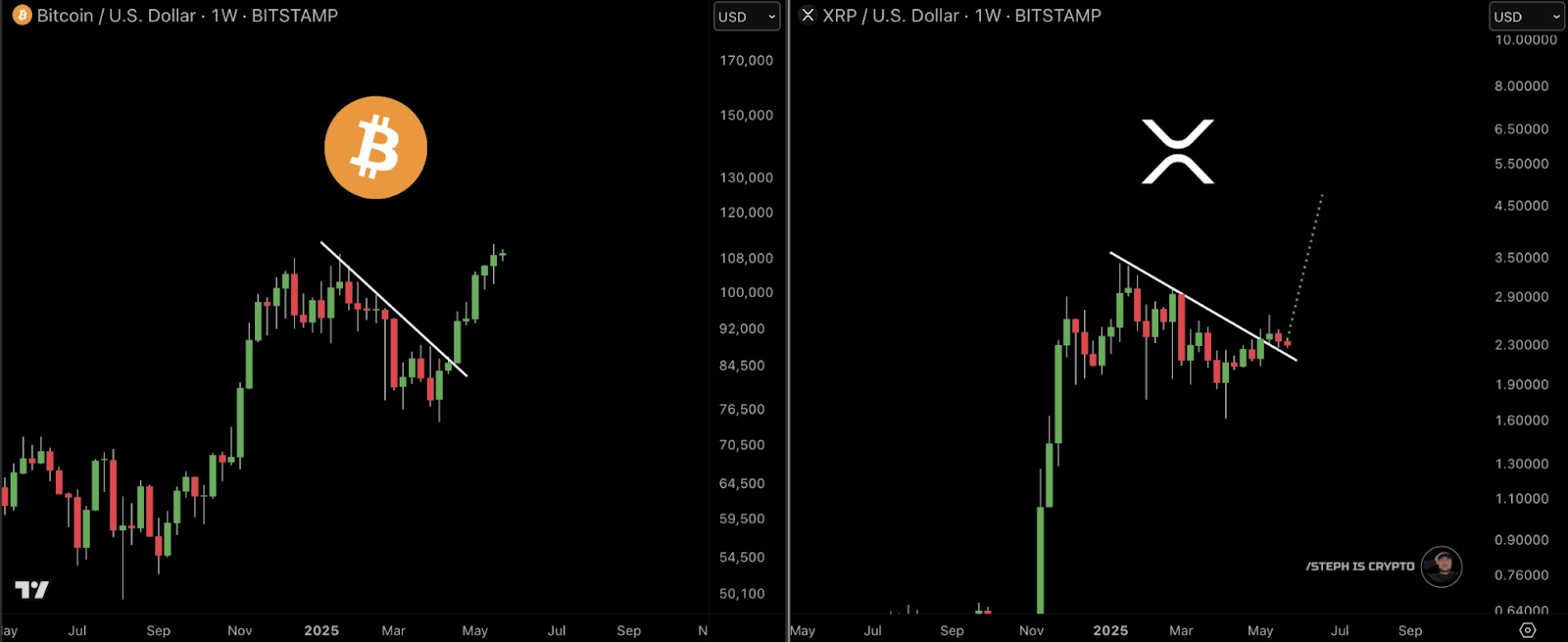 Между тем, аналитики предполагают, что XRP может иметь еще больший потенциал роста. Стеф крипто предложил, что XRP находится на грани взрыва. Следует по стопам биткойнов. Для контекста Стеф предоставил диаграмму, показывающую, что XRP следует за тенденцией Биткойна. Новаторская криптовалюта вырвалась из клина на еженедельной графике в середине -апреле. Это инициировало митинг, который достиг текущей записи всех времен на уровне 112 000 долларов США.