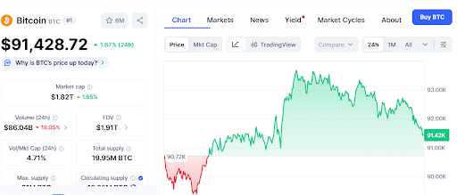 Биткойн отступил от максимума в 93 000 долларов. На момент публикации цена акций перешла из рук в руки на уровне $91 428, не сумев сохранить устойчивую тенденцию к росту. Это еще больше усиливает широко распространенное мнение о том, что бычий цикл, возможно, подходит к концу.