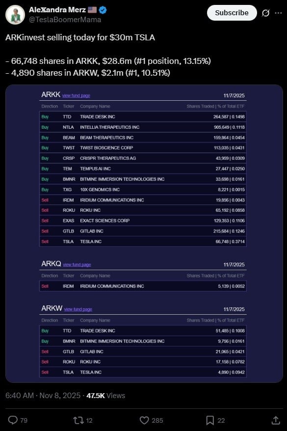 Рынок воспринял этот шаг как тревожный сигнал, поскольку Вуд является большим энтузиастом действий Маска и его видения развития. Ее компания недавно предсказала, что к 2029 году акции Tesla достигнут $2600.