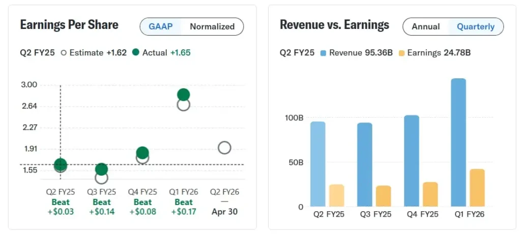 Apple представила ряд солидных отчетов. В первом квартале 2026 года компания показала 2,84 доллара на акцию (превышает 0,17 доллара) и Выручка $143,76 млрд (на $5,23 млрд, +15,65% г/г). Он также неизменно превосходил ожидания в предыдущих кварталах: прибыль на акцию в четвертом квартале 2025 года — 1,85 доллара, прибыль на акцию в третьем квартале 2025 года — 1,57 доллара, прибыль на акцию во втором квартале 2025 года — 1,65 доллара… Каждый отчет превышает консенсус.