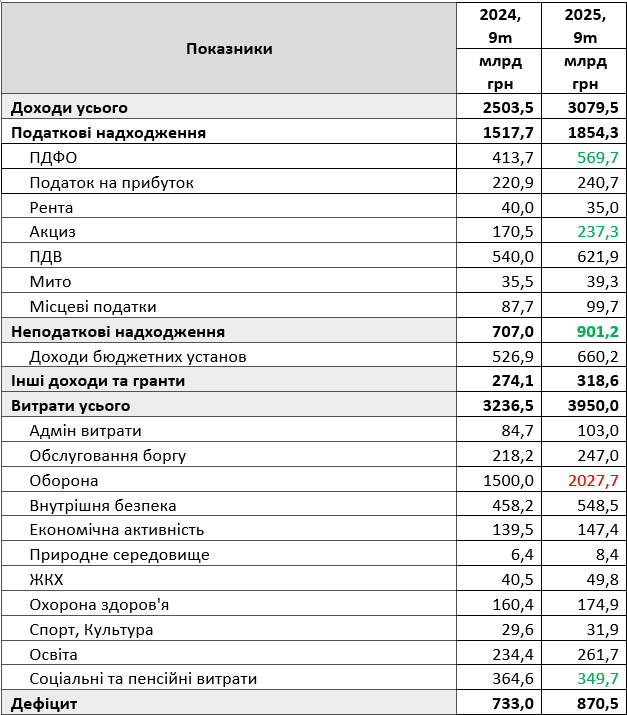 Консолидированный бюджет на 9 месяцев 2025 года закрылся с дефицитом 870,5 миллиарда гривен против 733,0 миллиарда гривен за январь-сентябрь 2024 года.