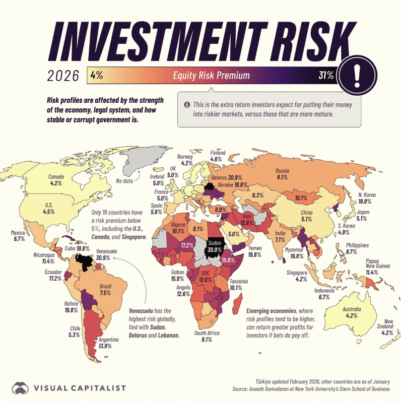 Visualcapitalist по оценкам профессора Нью-Йоркского университета Асвата Дамодарана подготовило карту, которая показывает премии за риск акций во всем мире. Эти премии отражают дополнительный доход, требуемый инвесторами для вложения средств в каждой стране, причем более высокие значения сигнализируют о большем воспринятом риске.