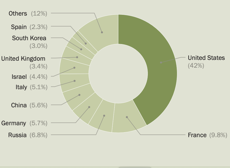 Соединенные Штаты остаются самым крупным экспортером оружия в мире. В 2021-2025 годах на них приходилось 42% всех международных поставок, в то время как в 2016-2020 годах — 36%.