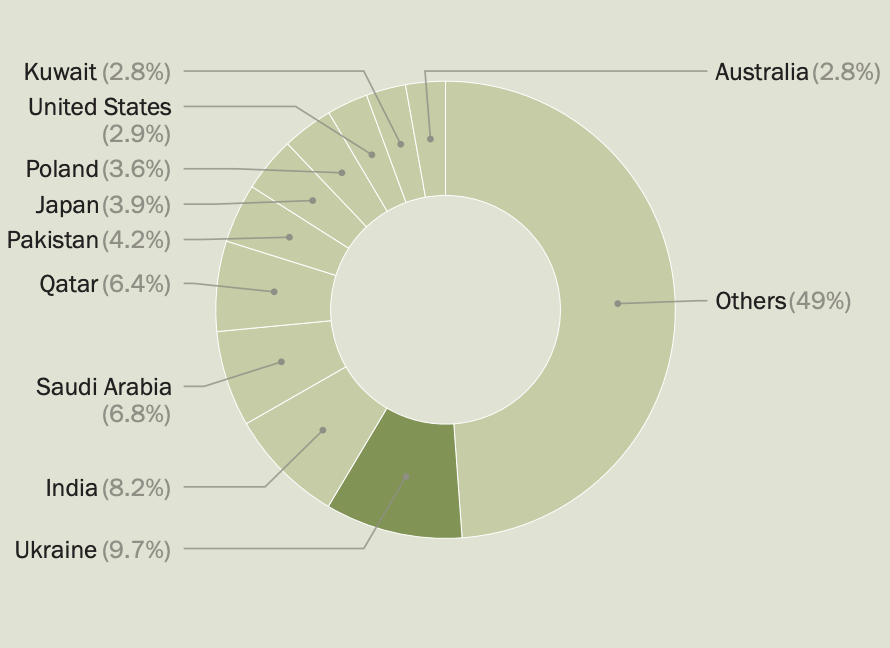 Россия же стала единственным государством из первой десятки экспортеров, у которой произошло резкое падение поставок. Ее экспорт сократился на 64%, а доля на мировом рынке упала с 21% до 6,8%.