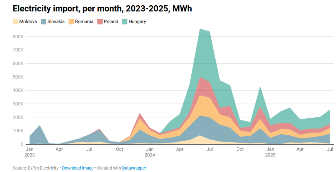 В июле 2025 года импорт электроэнергии увеличился на 24,7% по сравнению с предыдущим месяцем до 257,7 тыс. МВтч.