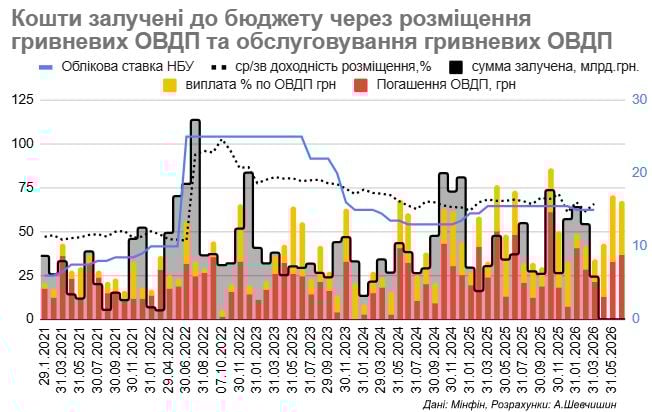 По данным Министерства финансов, в 2026 году правительство планирует привлечь через ОВГЗ около 420 млрд. гривен. С начала года по конец марта на аукционах уже собрали более 142 млрд грн. В то же время, Минфин вынужден удерживать высокую доходность по облигациям (около 15,1%-16,1% годовых), чтобы искусственно поддерживать интерес инвесторов. Из-за отсутствия лучших альтернатив на рынке, вложения физических лиц достигли исторического максимума, превысив 131 млрд грн. Кроме того, правительство активно использует так называемые switch-аукционы — фактически обменивает старые долги на новые, как это произошло в конце марта на сумму 8,37 млрд. грн. Этот инструмент создает иллюзию стабильности, но не решает фундаментальную проблему роста стоимости обслуживания обязательств.