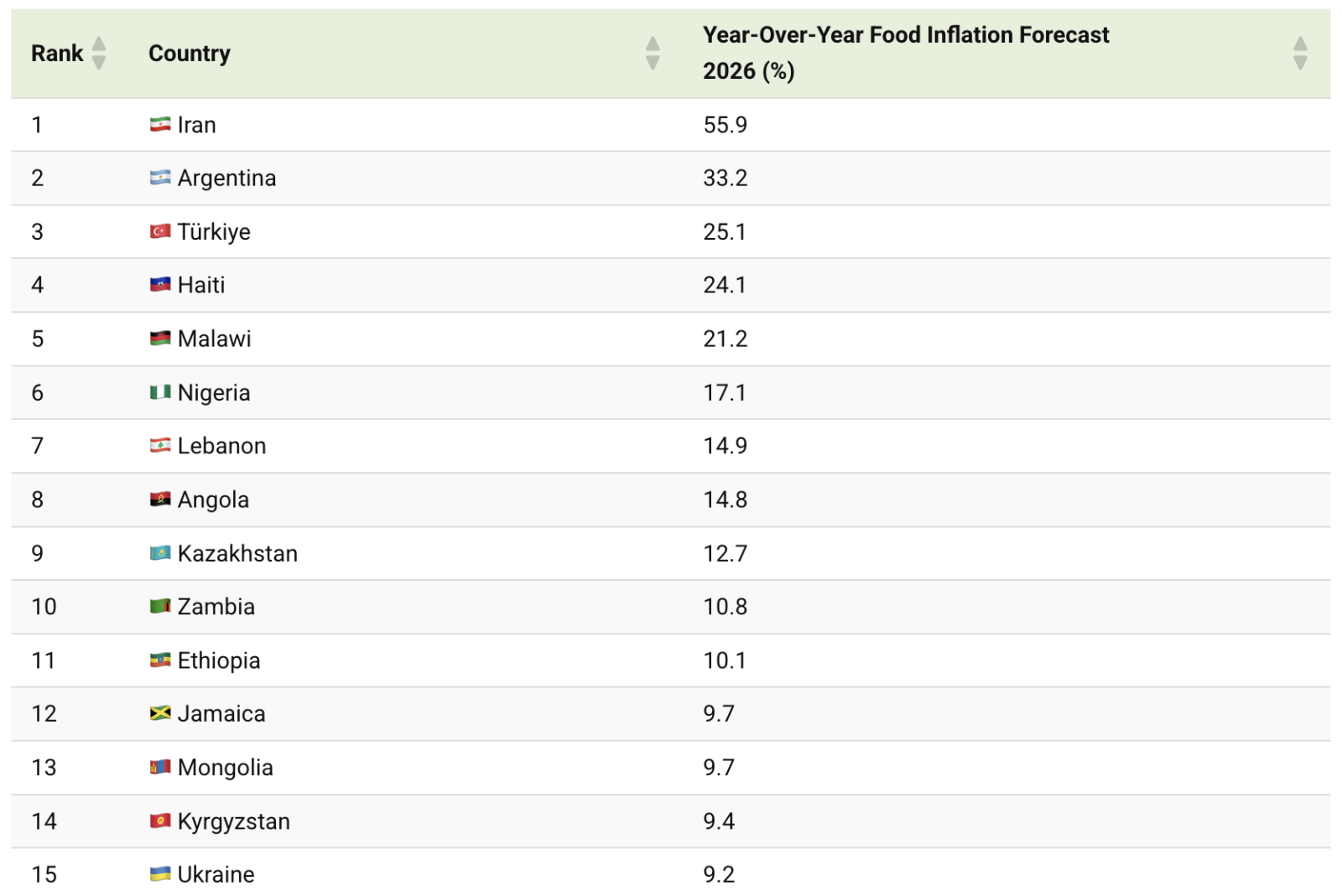 Наибольший скачок ожидается в Иране — +55,9% в год. Высокая инфляция и давление на национальную валюту продолжают оказывать существенное влияние на стоимость продуктов в стране. В тройку также вошли Аргентина (33,2%) и Турция (25,1%), где многолетние инфляционные тенденции остаются определяющим фактором ценовой динамики.