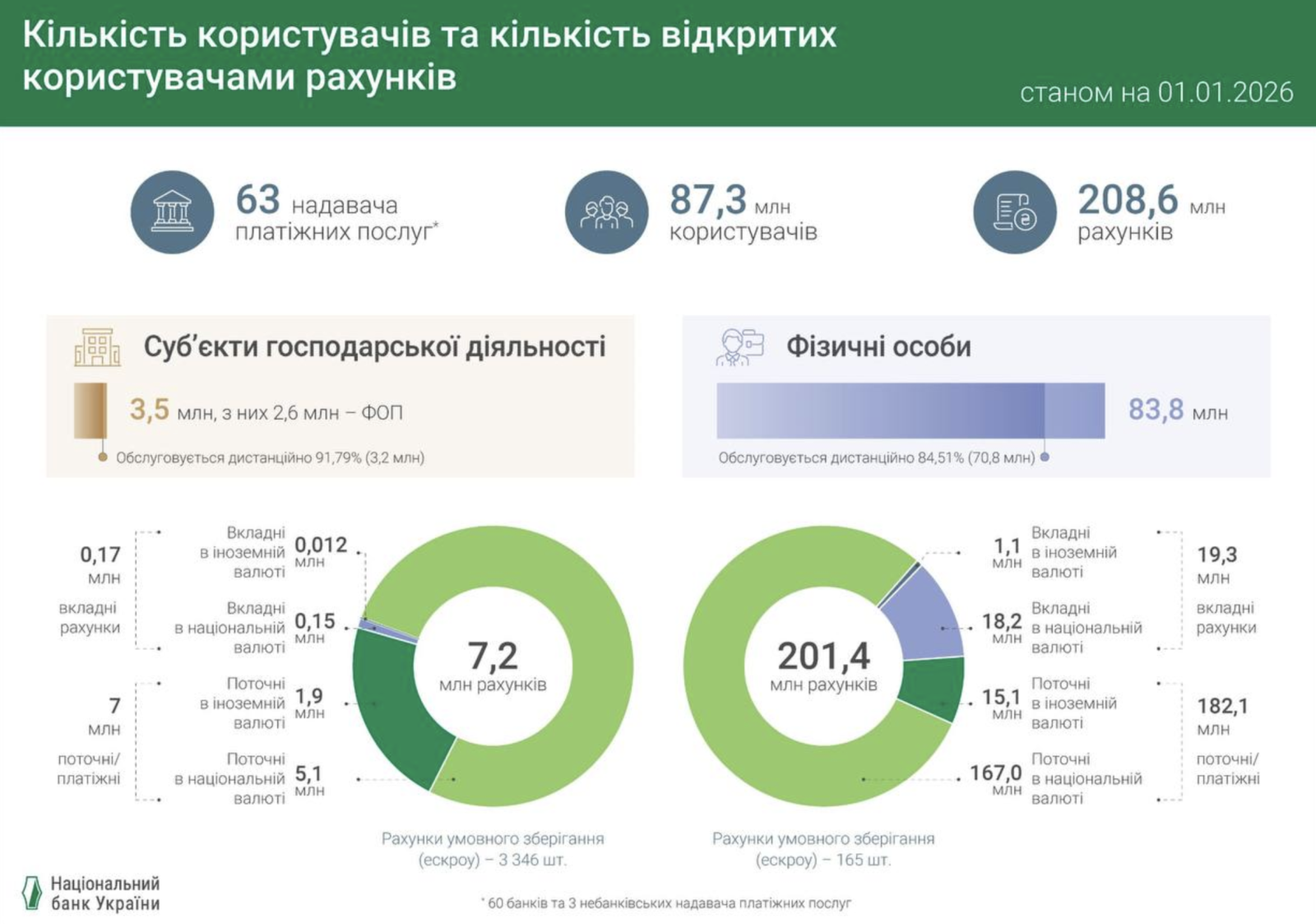 По состоянию на 1 января 2026 года украинцы и бизнес открыли у поставщиков платежных услуг 208,6 млн счетов, что на 8,2% больше, чем годом ранее. Об этом сообщил Национальный банк Украины.