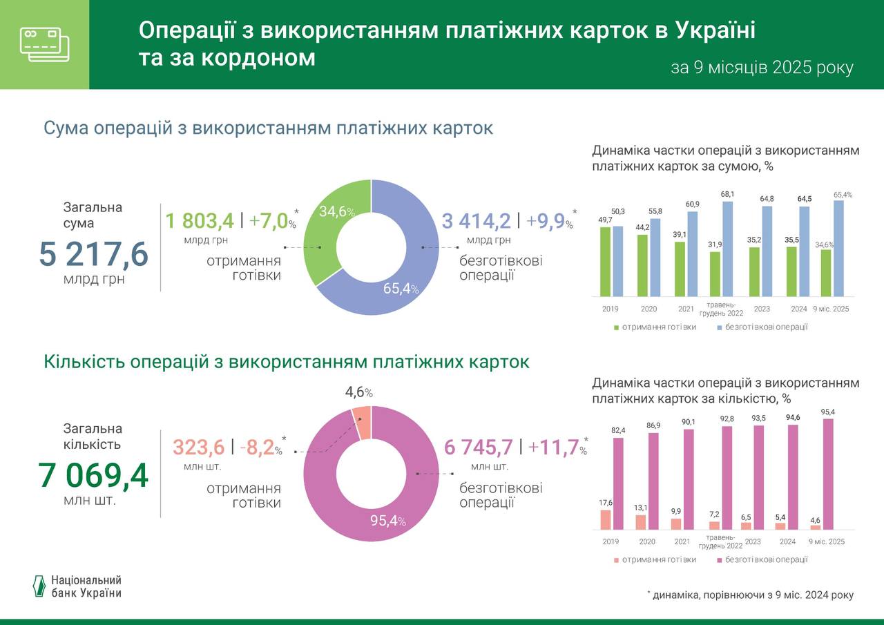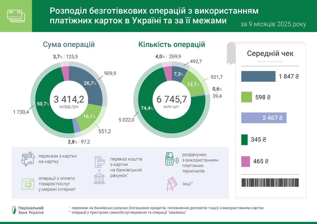 Остальные операции были бесконтактными (с помощью бесконтактной карты или с помощью смартфонов и других гаджетов). Их сумма за девять месяцев 2025 года составила 1 686,3 млрд грн (за девять месяцев 2024 года — 1 349,1 млрд грн).