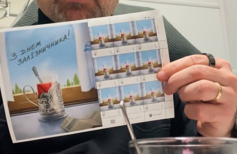 На другом почтовом блоке изображен один из символов «Укрзализныци» — «железный чай» в фирменном стакане.