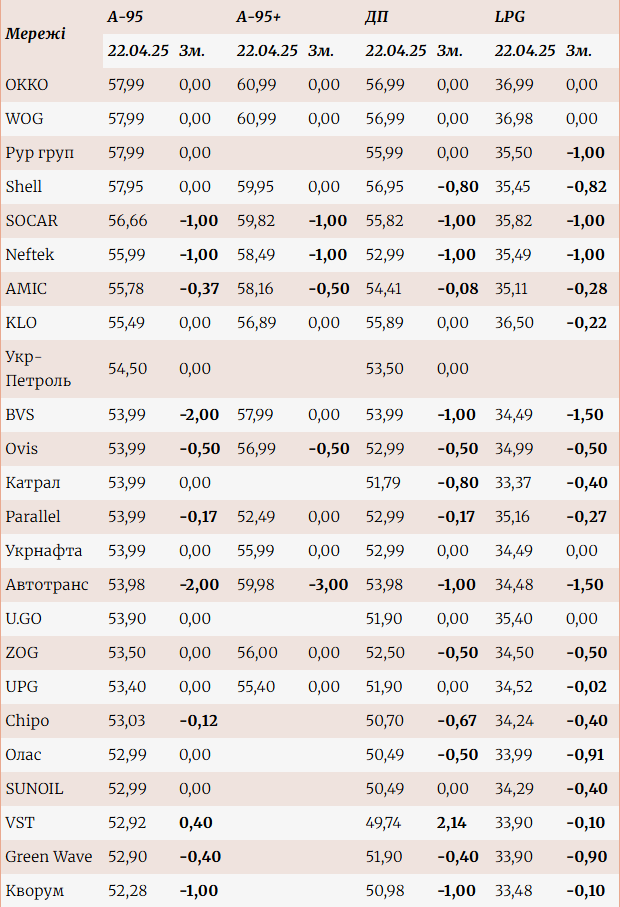 Изменение розничных цен на топливо на станции заполнения с 14 по 22 апреля 2025 года, uh/l: