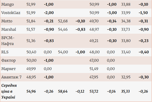 Чемпионы недели были сетями Полтавы BVS и Autotrans: бензин и дизель были уменьшены на 2 UAH/L и 1 UAH/L соответственно (до 53,99 UH/L каждый), газ — на 1,50 uah/L (34,49 UAH/L).
