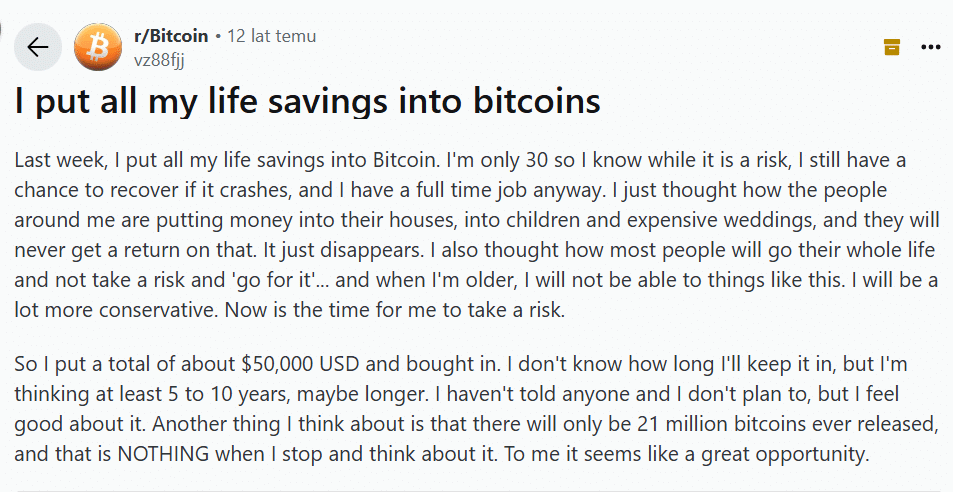 Сегодня такие инвестиции в самую большую криптовалюту не будут сбить вас с толку. Это разные несколько лет назад. Затем цена BTC колебалась около 250 долларов. Это означает, что его депозит дал ему около 200 BTC. «Я также думал, что большинство людей проведут свою жизнь, не рискуя. Когда я стану старше, я не смогу себе это позволить. Я буду гораздо более консервативным. Теперь пришло время рисковать», — он мотивировал свой спорный выбор.