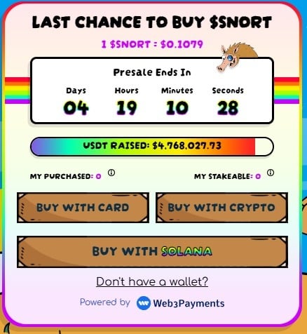 В настоящее время продолжается предпродажа (предпродажа) Токен $SNORT вступает в завершающую фазу. По данным проекта, почти 5 миллионов долларова цена токена автоматически увеличивается каждый день, пока этап не закончится.