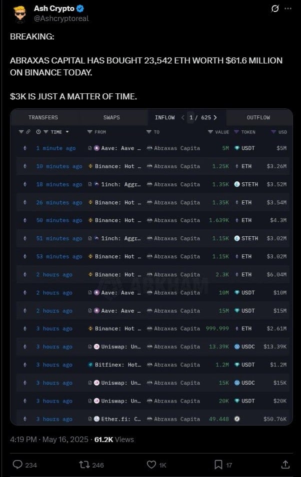 ETH также регулярно покупает Abraxas Capital. Последние данные показывают, что только вчера компания купила 23 542 ETH, на что она заложила 61,6 миллиона долларов США. В этом случае большинство покупок было сделано на бирже Binance и Uniswap.