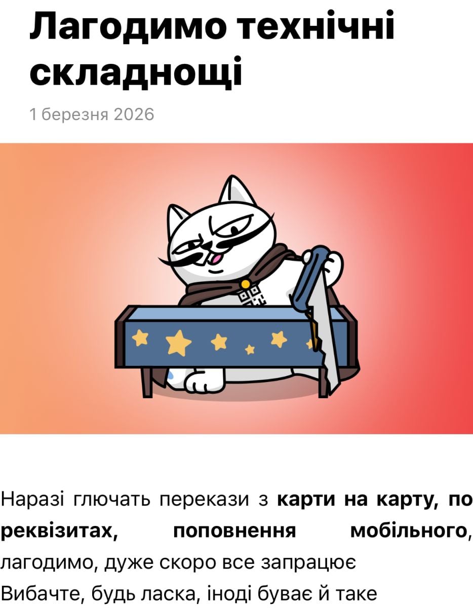 В воскресенье, 1 марта, в приложении monobank произошел сбой. Пока не работают базовые операции. Об этом сообщается в приложении банка.