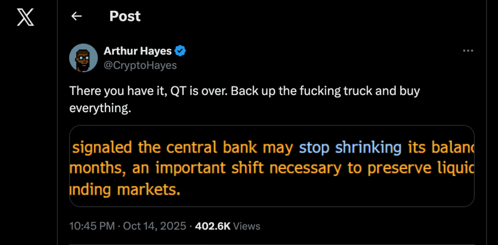 Тем не менее, Эдвардсу и другим нравится Соучредитель BitMEX Артур Хейссохранять оптимистический настрой в отношении макроэкономической ситуации. Хейс призвал участников рынка«купить всё» после предложения председателя Федеральной резервной системы Джерома Пауэлла о том, что Количественное ужесточение завершилось. Изменение политики исторически благоприятствовало рынкам криптовалют.