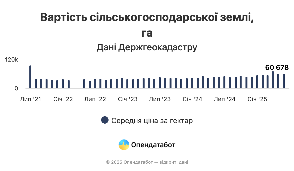 Так, например, из 10 лучших компаний в агросфере в соответствии с индексом Opendabot 2025, половина имеет иностранные корни. По состоянию на март количество транзакций превышало 9 тысяч в месяц, а общая ежемесячная стоимость транзакций — более 1 миллиарда долларов США. Цена на гектар в 2024 году варьировалась от 43-52 тысяч uh.