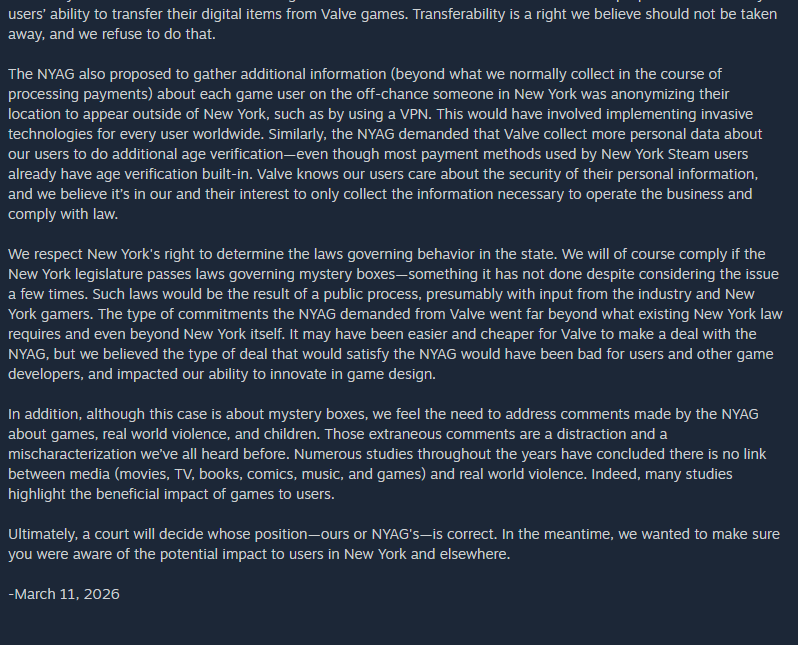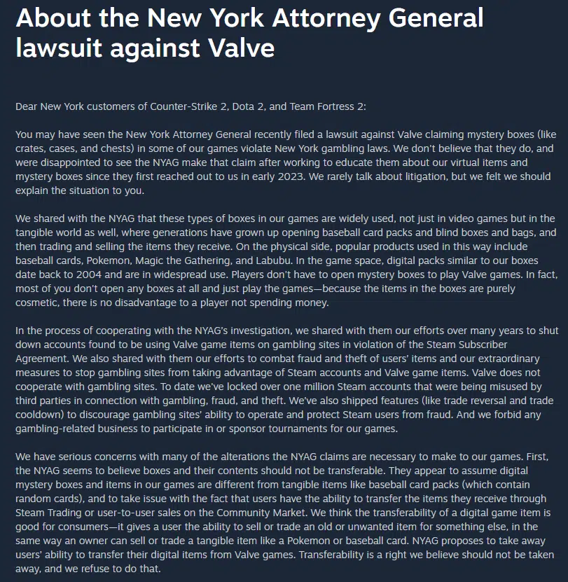 В самом начале заявления Valve компания задается вопросом, действительно ли лутбоксы, которые она предлагает в своих играх, нарушают упомянутые правила. Он также упоминает, что власти Нью-Йорка впервые обратились к нам по этому поводу в 2023 году. Тогда Valve пыталась объяснить, как работают коробки и другие контейнеры в играх, но, по словам компании, это не дало никаких результатов.