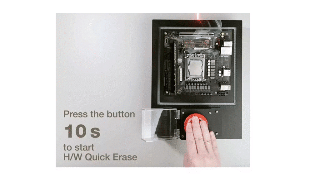 Что касается самих устройств, он оснащен саморазрушительными системами, которые гарантируют возможность уничтожения данных. Диск имеет два режима безопасности. Первый, активированный большой кнопкой, позволяет ручным форматированию диска «голая земля». Он разрушает данные, но сам диск подходит для многократного использования и использования. Второй режим на самом деле напоминает климат фильма. Это вариант физического разрушения устройства. После активации (нажатия долгое время) электрический импульс с высоким напряжением физически разрушает диск, «жаряя» системы флэш -памяти.