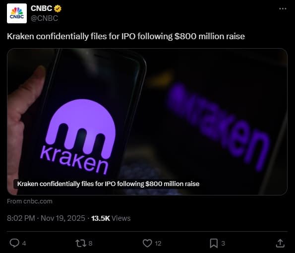 Похоже, Kraken — следующая компания, которая расширит свою деятельность. Одна из самых популярных криптовалютных бирж объявила, что подала заявку в Комиссию по ценным бумагам и биржам США на проведение первичного публичного размещения акций. Это свидетельствует о намерении выйти на биржу. В рамках IPO компания планирует привлечь $800 млн. Компания планирует использовать эти средства для экспансии на внешние рынки, а также для развития платежных услуг. По данным Reuters, компания, вероятно, дебютирует на фондовой бирже в первом квартале 2026 года.