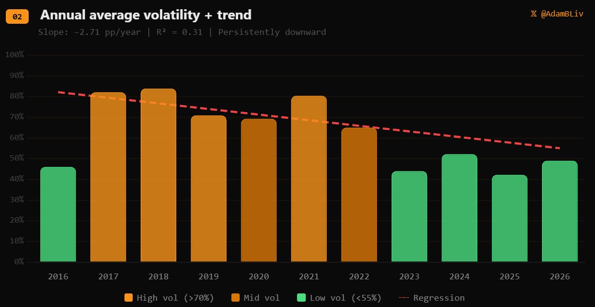 - Снижение амплитуды: если в 2018-2019 гг. средняя 90-дневная волатильность составляла 77,4%, то в 2026 году она опустилась до 47,4%.
