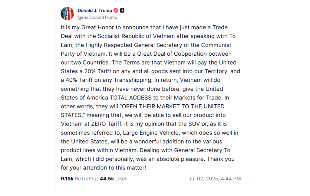 Новости о соглашении о том, что Социалистическая Республика Вьетнамская (как звучит официальное название этой страны — и ни в коем случае не необоснованно, учитывая ее внутренние реалии) с Соединенными Штатами Америки, пришли от кого -то другого, кроме Дональда Трампа в его собственной лице. Сказал, что объявил их в длинном посте На вашей любимой социальной среде, истина.