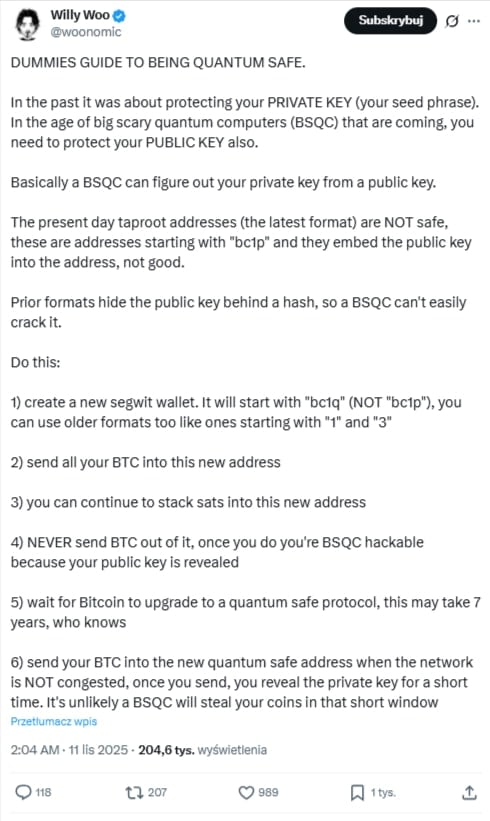 Segregated Witness — это обновление протокола Биткойн, реализованное в 2017 году. По словам Ву, стандартные адреса Taproot встраивают открытый ключ в сам адрес, что делает его уязвимым для атак квантовых компьютеров. SegWit, с другой стороны, скрывает открытый ключ до тех пор, пока транзакция не будет записана. Отсюда вывод: в эпоху «Большой паники перед квантовыми компьютерами» (BSQC) необходимо защищать не только закрытый ключ, но и открытый ключ.