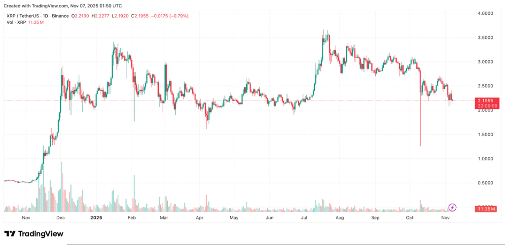 XRP не смог прорваться выше $2,50 и в настоящее время торгуется около $2,29. За последние 24 часа он снизился примерно на 2%. С августа график демонстрирует последовательную картину более низких максимумов и более низких минимумов. Тенденция Уорда предполагает продолжающееся давление со стороны продавцов. Зона $2,60–2,70 часто бывает сильным уровнем отклонения, где встречаются все ключевые скользящие средние, усиливая общую медвежью картину.