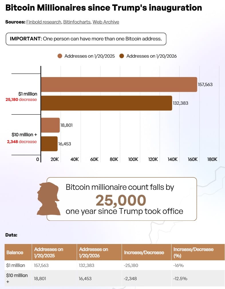 Финболд проанализировал данные блокчейна за этот период, и они не выглядят оптимистичными. За последний год, после прихода к власти Дональда Трампа, количество адресов криптовалютных миллионеров сократилось на целых 25 тысяч. Более того, когда Дональд Трамп стал президентом Соединенных Штатов во второй раз, существовало 157 563 биткойн-адреса, на которых хранились BTC на сумму не менее 1 миллиона долларов. В январе 2026 года, через год после его президентства, это число упало до 132 383 адресов. Это означает, что количество адресов, на которых хранятся BTC на сумму не менее 1 миллиона долларов, уменьшилось на 25 180. Это снижение примерно на 16%.