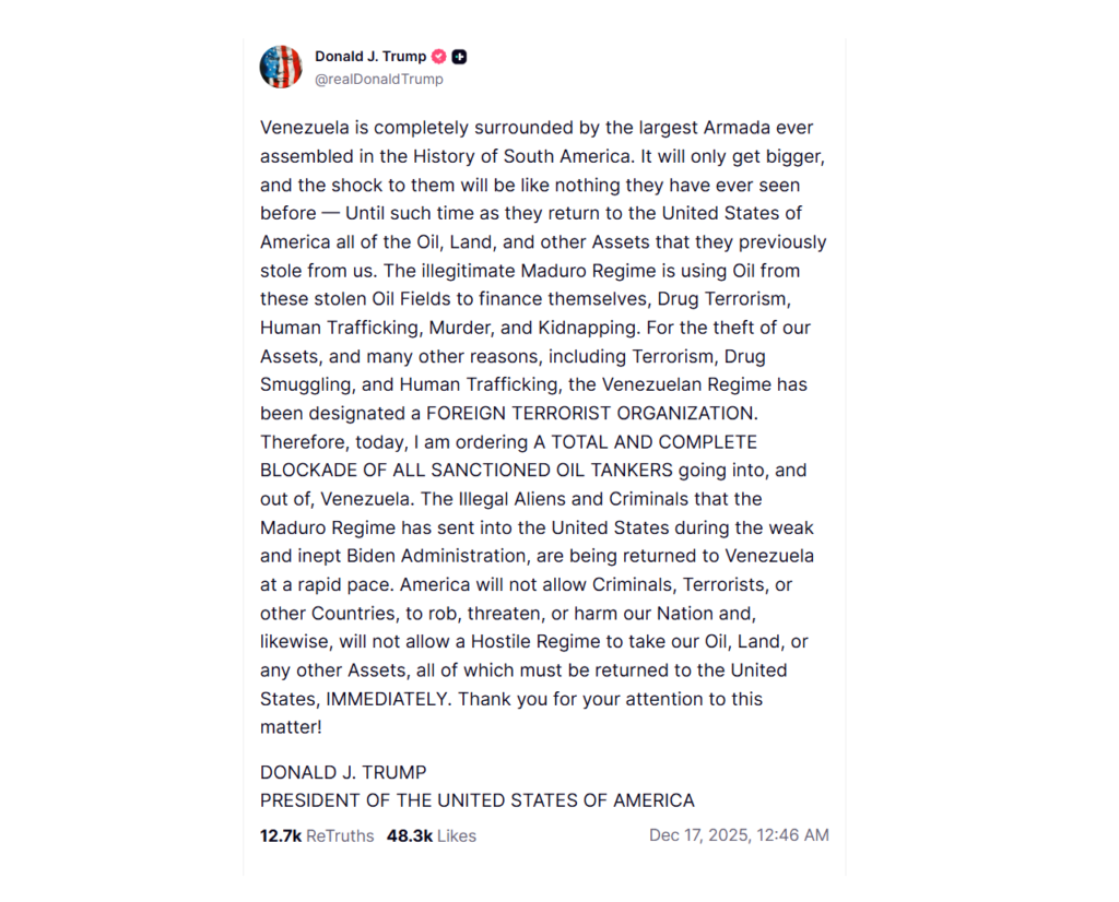 Военно-морские и военно-воздушные силы США установили «полную и полную» военно-морскую блокаду побережья Венесуэлы. Тотальный и полный – но не такой полностью и полностьюблокада концентрирует о морских перевозках, обслуживающих экспорт и импорт главного природного ресурса, которым располагает Венесуэла, – нефти. Такое развитие событий было предсказуемо на прошлой неделе, когда американские власти захватил танкер транспортировка венесуэльской нефти.
